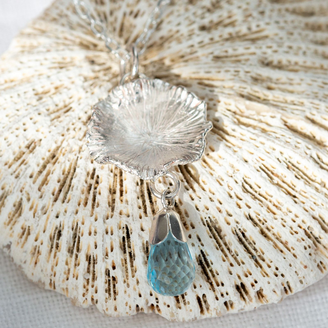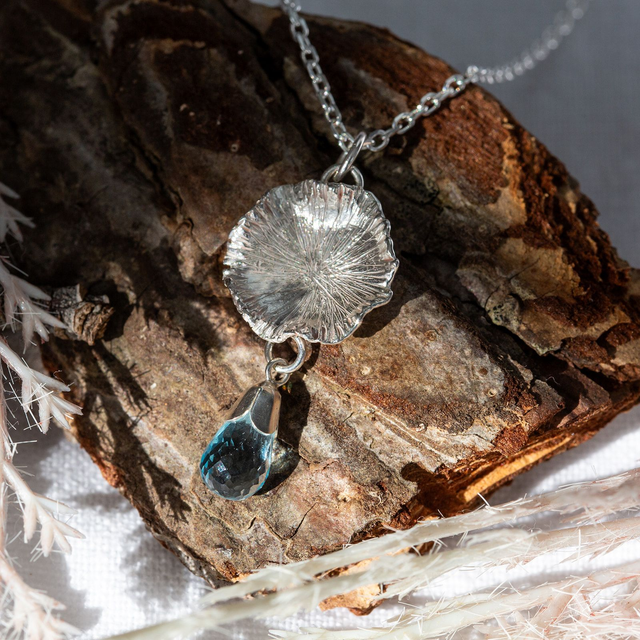 Solid silver scalloped pendant with a soft blue Aquamarine briolette drop. Pendant hangs from a cut hammered trace chain in 16 or 18 inch.