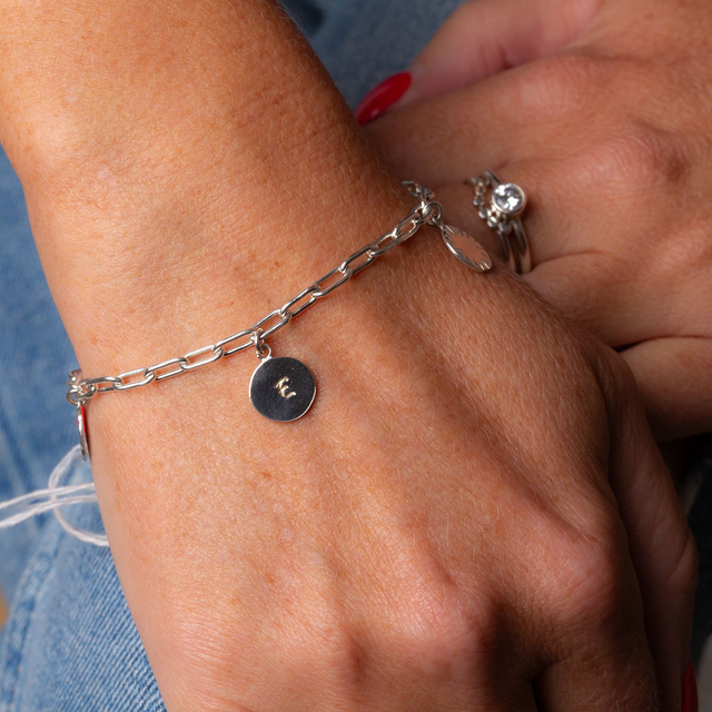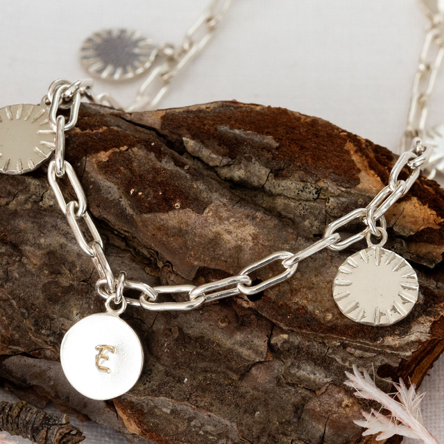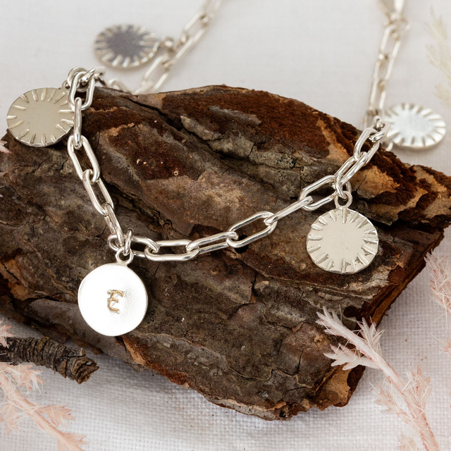 Other 4 charms have line hammered details but additional initials can be put on to bracelet if requested.