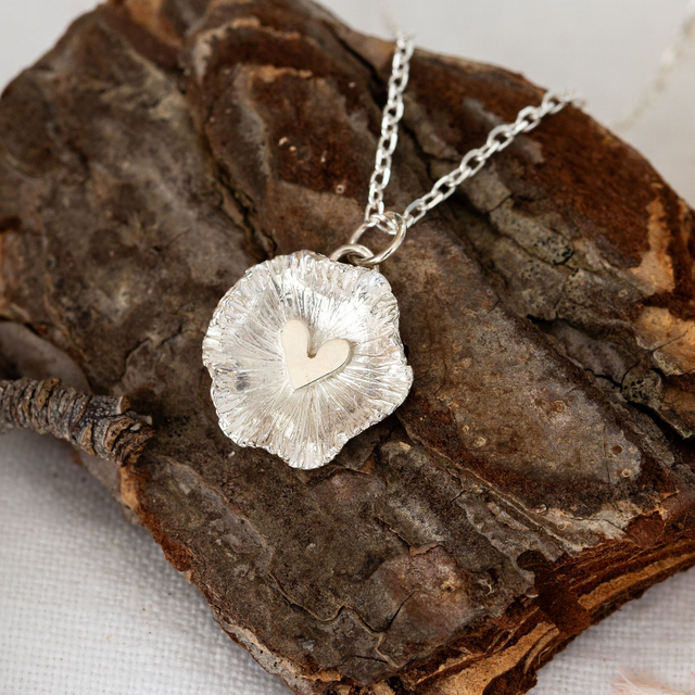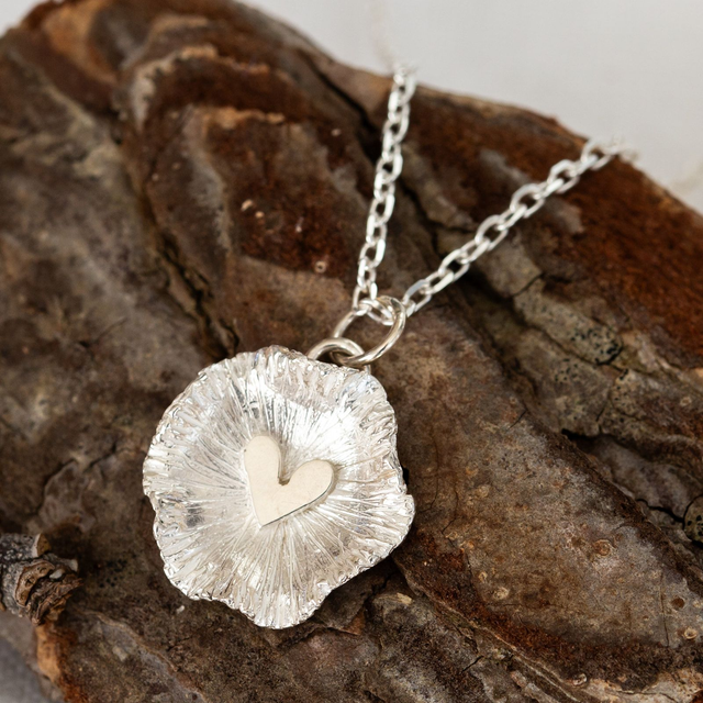 Solid silver Scalloped pendant with hand pierced heart on a cut hammered trace chain in 16 or 18 inch chain.