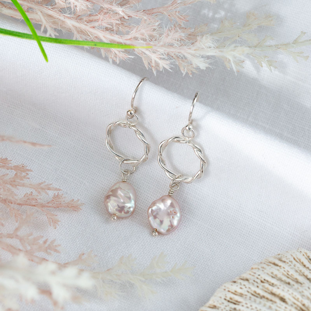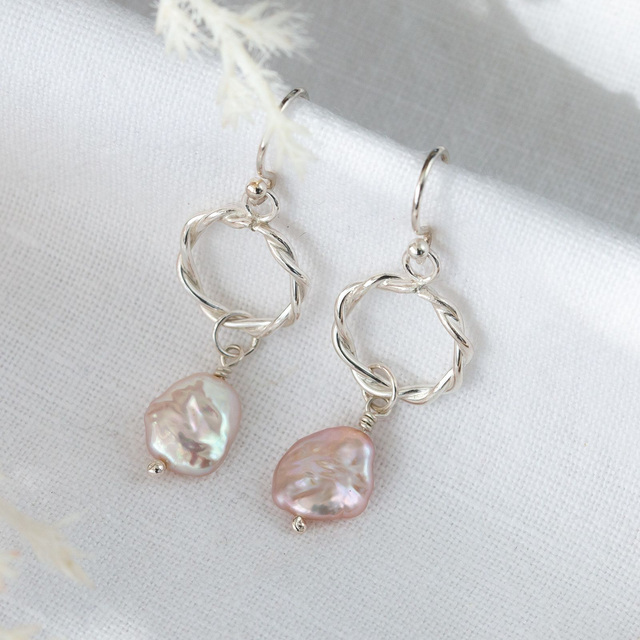 Solid silver twisted wire hoop earrings with a baroque freshwater pearl drop. Warm peachy/pink pearl with shepherds hook.